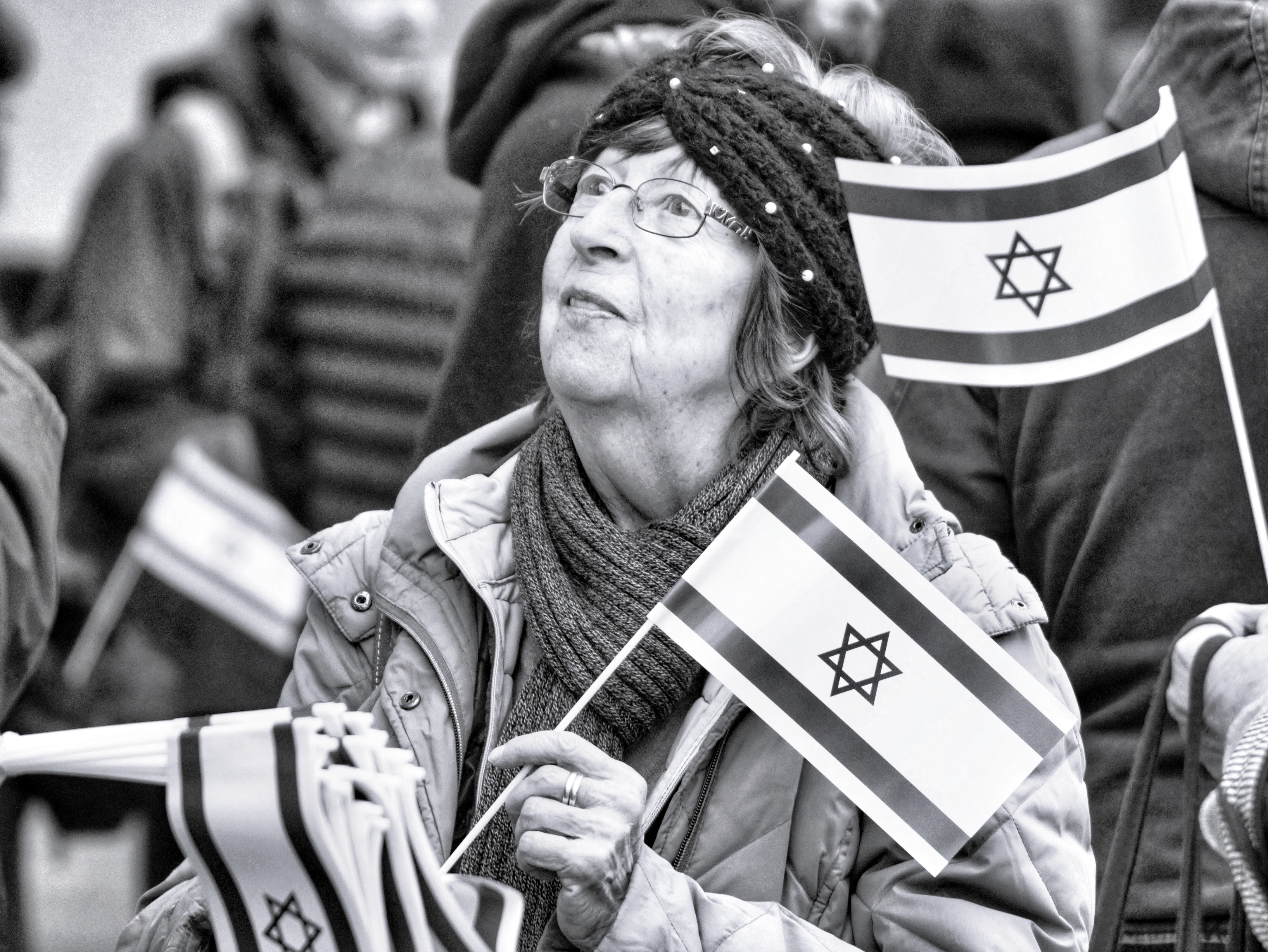 Eine Teilnehmerin einer pro-israelischen Kundgebung hält mehrere israelische Fahnen in der Hand. Die Aufnahme entstand im Oktober 2021 in Hamburg, wenige Monate nach dem Aufflammen der Eskalation zwischen Israel und der Hamas im Mai desselben Jahres. Die Demonstration war Teil zahlreicher Solidaritätsbekundungen in deutschen Städten.