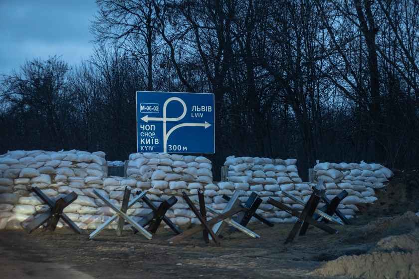 „Mein erster Aufenthalt in der Ukraine im März 2022 war eigentlich ungeplant“, erzählt er. „Ich habe in Krakau als Fixer für den amerikanischen Journalisten Sevin Matozzi gearbeitet. Unsere gemeinsame Story drehte sich um jüdische Geflüchtete aus der Ukraine, die in Polen von der dortigen jüdischen Gemeinde aufgenommen wurden.“ Im Verlauf der Zusammenarbeit mit Matozzi entstand eine neue Idee: Es wäre sinnvoll, die Geschichte auch von der anderen Seite der Grenze aus zu erzählen – mit Bildern direkt aus der Ukraine. Nur einen Tag später sitzt Schneidereit im Auto, auf dem Weg nach Lwiw, der westukrainischen Stadt nahe der polnischen Grenze. „Es war schwierig, dort zu fotografieren“, erinnert er sich. „Gerade an den Grenzübergängen war das streng verboten, überall standen schwer bewaffnete Soldaten. Ich hatte zwar meinen deutschen Presseausweis dabei, aber keine offizielle Akkreditierung von ukrainischer Seite.“ Trotz aller Einschränkungen entstehen während der zweitägigen Reise rund 200 Bilder – Momentaufnahmen eines Landes im Ausnahmezustand. Schneidereits persönliches Lieblingsmotiv: ein Ortseingangsschild mit Richtungsangaben nach Lwiw und Kiew, umstellt von Sandsäcken und Panzersperren.